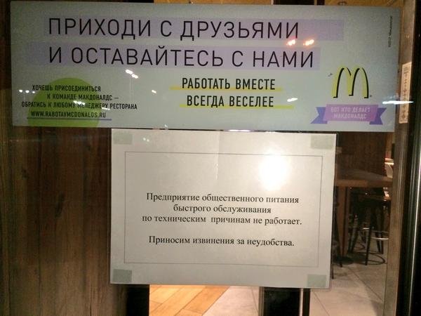 Санитарные службы приступили к массовым проверкам сети McDonald's в России в августе 2014 года. Эти инспекции привели к закрытию десяти ресторанов, в числе которых оказалась первая точка в России, открытая на Пушкинской площади в Москве в 1990 году. В настоящее время рестораны этой сети работают в 75 регионах России.