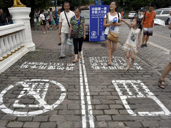 Тротуар разделен на две части: на одной из них можно во время ходьбы проверять почту, общаться в социальных сетях или делать селфи, а на другой пользование телефоном запрещено.