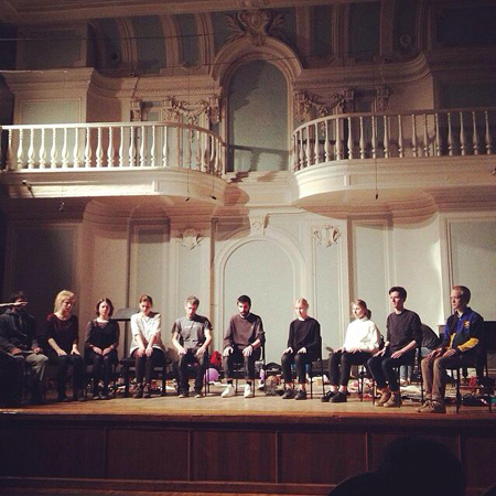 © Даша Стрелкова Выступление скрэтч-оркестра в Рахманиновском зале Консерватории 2) «Репетиция оркестра» — спектакль, поставленный в Театре на Таганке, переживавшем сложное время в отсутствие режиссера. Главный мотив этого периода в настроениях работников театра — «безотцовщина». Сильный и обожествляемый режиссер, Юрий Любимов, ушел, а нового режиссера, который взял бы театр в свои крепкие руки, о чем мечтали актеры, еще не нашлось. Кроме того, часть труппы театра, боясь потерять «зрителя Таганки», агрессивно воспринимала возможность любых перемен. Инициатива по обновлению театра руками «Группы юбилейного года», исходившая от депкульта Москвы, вызывала в памяти историю с «Гоголь-центром» и увольнением тамошней труппы. Над актерами, привыкшими быть «прикрепленными» и вписанными в защищенный и вместе с тем ригидный «театр-как-дом» с традициями и фотографиями Высоцкого по стенам, нависла потенциальная опасность быть выкинутыми в мир эффективных контрактов и общегородской культурной гонки. Но кроме того, часть труппы испытывала отвращение к молодым режиссерам, не являвшимся теми «великими» мастерами, которых они готовы были ждать вечно. Театр трясло, приглашенная команда встретила серьезное сопротивление части труппы. В этой ситуации режиссер Андрей Стадников и ставил свой спектакль, основанный на материале, собранном в технике вербатим с младшего и технического персонала театра: актеры читали монологи, которые сами же записали у работников сцены, электриков, костюмерш, секретарш и охранников — речь, понятно, шла об опыте работы этих людей в Театре на Таганке, когда-то мощной институции, утратившей свою скрепляющую силу. Хореографическая (пластическая) часть сводилась к тому, что во время монолога актер раз за разом компульсивно воспроизводил подмеченный у своего интервьюируемого характерный жест. (Надо добавить, что «Группа юбилейного года» работала в театре ограниченный отрезок времени и ничего сравнимого с увольнениями в «Гоголь-центре» там не произошло.)