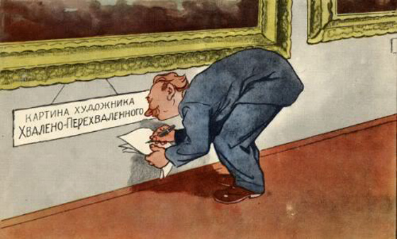 Из журнала «Крокодил», 1953 год Многих волнует «отсутствие рынка» в системе российского современного искусства. А отсутствие критики как основополагающего звена той же системы почему-то мало кого беспокоит. В такой ситуации два с половиной доморощенных коллекционера со спокойной душой могут тешить себя мыслью о том, что именно они по дешевке и определяют, где хорошее искусство, а где — вовсе недостойный внимания мусор. Они без зазрения совести выпрашивают у художников работы «в подарок» или выторговывают их за бесценок, пребывая в уверенности, что оказаться в их так называемой коллекции — это предел мечтаний несчастных авторов.