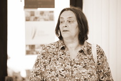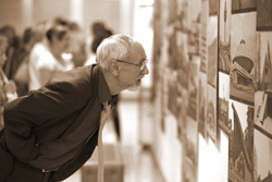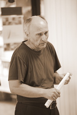 Его представитель Александр Середа предпринял робкую попытку совместить стихийный круглый стол со своим бенефисом. В том же тоталитарном стиле, что и архитектура на фото, была организована аудитория – несколько рядов стульев перед столом, за который встал куратор выставки. В качестве запевки Середа стал зачитывать манифест движения.