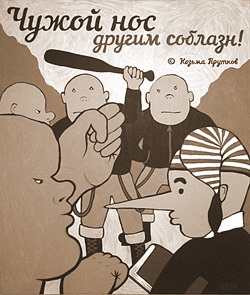 Поодиночке это картины-плакаты, а собранные вместе, развешенные по стенам – это уже портрет эпохи. Не той, советской, а нынешней. Эпохи, когда советские карикатуры на глазах превращаются в российские законодательные акты. На страже нового порядка стоят бритоголовые люди с бейсбольными битами. Кругом бродят коварные враги - волки в овечьей шкуре. Аудитория бездумно хохочет. «Патриотично» ржёт.