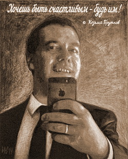 Имеется и другой путь: в основу ложится какой-нибудь заезженный афоризм Кузьмы Пруткова вроде «Хочешь быть счастливым – будь им!», а потом к нему пририсовывается самодовольное лицо человека, который четыре года подряд называл себя президентом России. Человек этот делает селфи, [ 3] то есть фотографирует сам себя. Он, безусловно, счастлив. На его лице – полное удовлетворение. Его жизнь удалась.