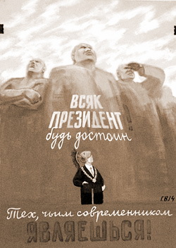 Нельзя сказать, что в псковском музее открылась выставка политического плаката. Но без политики там точно не обошлось. Если пройтись по длинному коридору Дома Фан-дер-Флита, то можно обнаружить даже обращение к президенту. На плакате Василия Голубева написано: «Всяк президент – будь достоин тех, чьим современником являешься!».