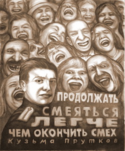 Одна из самых заметных (и самых современных) работ на выставке – картина Кирилла Миллера, основанная на прутковском афоризме «Продолжать смеяться легче, чем окончить смех». Это настоящее актуальное искусство. Перед посетителями предстаёт типичный наш современник - Человек ржущий. Его рассмешили, наверное, ещё лет двадцать назад. И он до сих пор смеётся, не в силах остановиться в своём механическом хохоте. Смеётся в основном хором. Шутки мельчают, но потребность поржать остаётся неизменной. Часто это зловещий смех. Такой смех отвлекает от действительности.