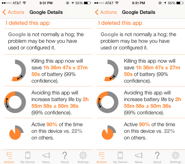 В приложении Normal можно сравнить свой расход заряда батареи с аналогичными устройствами у других пользователей. Normal показывает, на сколько увеличится время работы устройства, если закрыть то или иное приложение.