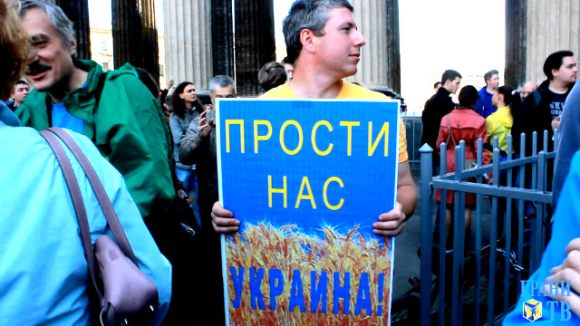 В Петербурге 21 сентября прошла самая массовая несогласованная антивоенная акция. На народный сход к Казанскому собору вышло несколько тысяч человек. Сюда же пришли их противники с флагами "Новороссии" и георгиевскими ленточками. Видео Владимира Волохонского.