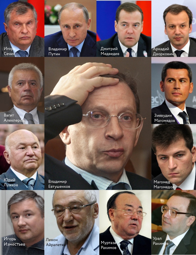 Судьба Владимира Евтушенкова складывалась на удивление ровно и удачно. Вплоть до середины сентября 2014 года. Два высших образования — еще в советское время, в нужных — для постсоветского времени — областях: химические технологии и экономика. Трудовая биография: от начальника цеха до замгендиректора большого объединения. В перестройку оказался в столичной власти, но не в политике — по технической и научной части, куда ветры перемен (и, следовательно, скорых отставок) если и доходили, то бюджетами для росших, как грибы, центров научно-технического творчества молодежи, под эгидой которых создавались первые бизнесы и делались первые состояния. Когда власть посыпалась, оказался рядом с мэром Москвы, всемогущим Юрием Лужковым, счастливо женился на сестре жены мэра, создал АФК «Система», получил частоты для своей МТС. Когда мэр бодался с президентом Ельциным, был в стороне. Когда мэра сняли «за несоответствие», оказался близок к снимавшему Лужкова президенту Медведеву. Но и к Путину был вхож. Тогда же удачно занялся «нефтянкой» и к своим 66 годам умно и, казалось, сохранно диверсифицировал активы: тут — технологии, там — вкусная недвижимость, здесь — 49 % в гуцериевской «Русснефти» и 89 % в «Башнефти», № 15 в российском спиcке Forbes, состояние $9 млрд, в партнерах, друзьях, ну да и врагах — богатейшие люди России (на фото слева — непосредственные фигуранты нынешней истории). 15 сентября — допрос в СК РФ, 16 сентября — домашний арест: «электронный браслет удобнее носить на левой ноге», — посоветовал ему в Твиттере оппозиционер Алексей Навальный. И всем вдруг стало понятно: что оппонент Путина Навальный с его квартиркой в Марьино, что миллиардер Евтушенков с его особняком в Жуковке — от глаз опричников не может скрыться никто. Пересажали и отправили по этапам нелояльных в то время, как лояльные говорили: «пошли против власти — получили свое». Теперь пришло время лояльных. И очень лояльных. Где просчитался, что не учел миллиардер Евтушенков и кому пора паковать чемоданы — о том в главной теме номера.