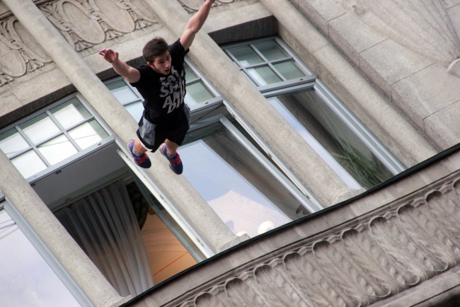Улица Некрасова перекрыта, с третьего этажа Большого театра кукол с воплями кидаются на огромную воздушную подушку любители паркура.
