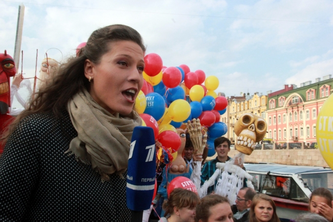 Журналистка Первого канала скороговоркой выпаливает на камеру: «Санкт-Петербург теперь не только северная, но и кукольная столица, и дело отнюдь не в размерах… Ну что, нормально записалось?»