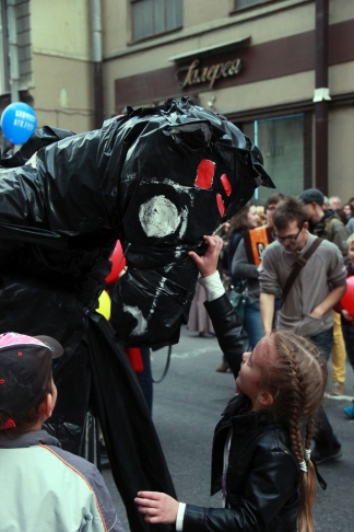От Аничкова моста до Большого театра кукол вся толпа движется пешком. Целлофановый конь застревает на перекрестке. Грустно машет копытом – мол, не ждите меня.