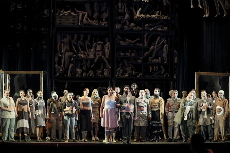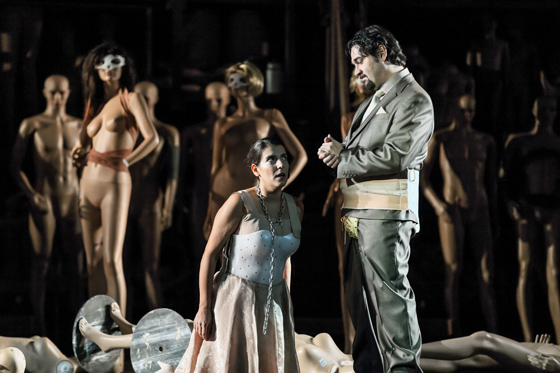 © Пермский театр оперы и балета Настоящих манекенов в постановке очень много. Дополненные видеорядом в жанре нуар, они заполняют хитро затемненную сцену (художник по свету — Петер ван Прает) в качестве декораций (сценографы — сама Карраско и Эстерина Зарилло). Среди них плутает обслуживающий их персонал, а также, собственно, герои оперы Моцарта, так что заблудиться и обознаться, как того требует сюжет, не составляет никакого труда. Тела с женскими округлостями, груженные оптом и в розницу, отлично подходят для иллюстрации лепорелловой «арии со списком». Одновременно манекены — символ смерти.