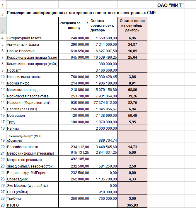 Сегодня «Анонимный интернационал» выложил в открытый доступ переписку сотрудников аффилированного с правительством Москвы ОАО «Московские информационные технологии» (МИТ). Официальная задача МИТ – «информационно-аналитическое сопровождение деятельности» мэрии Москвы. Как выясняется из переписки, это «информационное сопровождение» принимает иногда довольно интересные формы. В том числе, например, в письмах содержатся сметы «размещения информационных материалов в печатных и электронных СМИ». Вот одна из них: