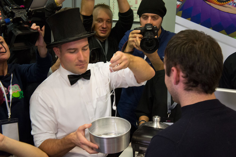 Фокусник складывает наушники, провод Lightning и инструкцию в специальное устройство. Сейчас будет понятно, зачем