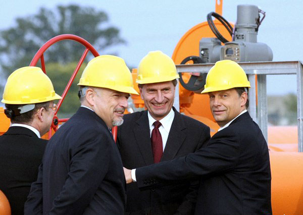 Гюнтер Эттингер и Виктор Орбан. Фото: szegedma.hu Венгрия начала реверсные поставки газа на Украину в марте 2013 года. Согласно договоренностям, FGSZ должен был поставлять Украине 6,1 млрд куб. м газа в год (16,8 млн куб. м в сутки), при этом поставки подразумевали «прерываемый режим в зависимости от текущих коммерческих и технических условий».