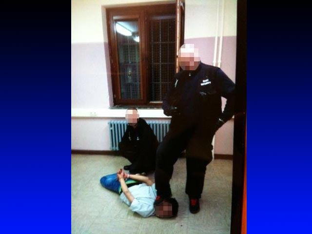 В воскресенье, 28 сентября, следователи продемонстрировали фото с мобильного телефона, на котором мужчина в наручниках лежит на земле лицом вниз, при этом нога охранника прижимает его шею к земле. Второй охранник в кадре просто сидит на корточках у ног человека в наручниках. По данным полиции, жертва - 20-летний беженец из Алжира.