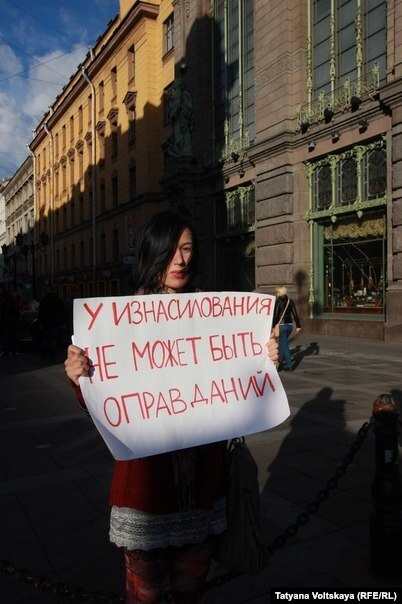 – Наша акция проходит не только в Петербурге, – говорит одна из организаторов Соня Любарова, – есть такая феминистская группа ВКонтакте – "Сестра сестре – взаимопомощь", и вот они организовали подобные пикеты в Москве, Казани, Киеве, Омске, Волгограде и Новосибирске. Здесь на наши пикеты прохожие реагируют в основном хорошо, только не все знают о том, почему мы здесь стоим с такими плакатами. Примерно половина людей читали об этом возмутительном случае – и их тоже реакция интернет-сообщества возмутила едва ли не больше самого факта изнасилования. Мы раздаем людям нашу листовку, где рассказана эта история – конечно, без личных данных. И люди, в основном, понимают, что мы хотим сказать нашей акцией.