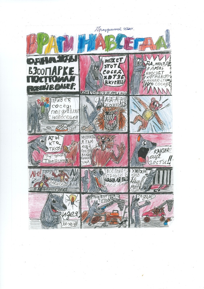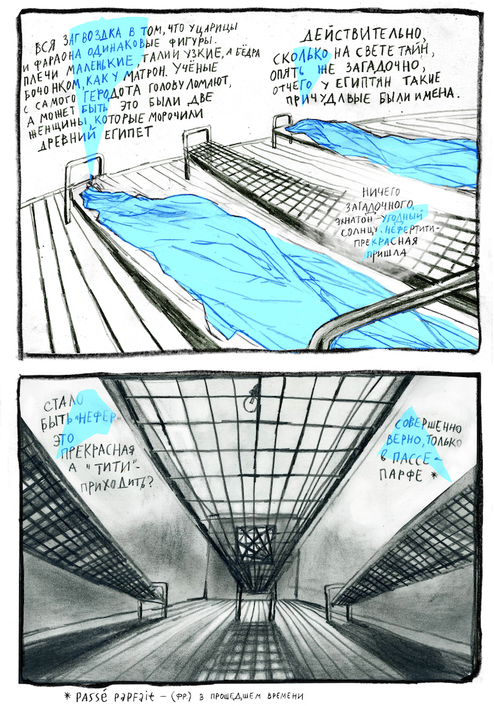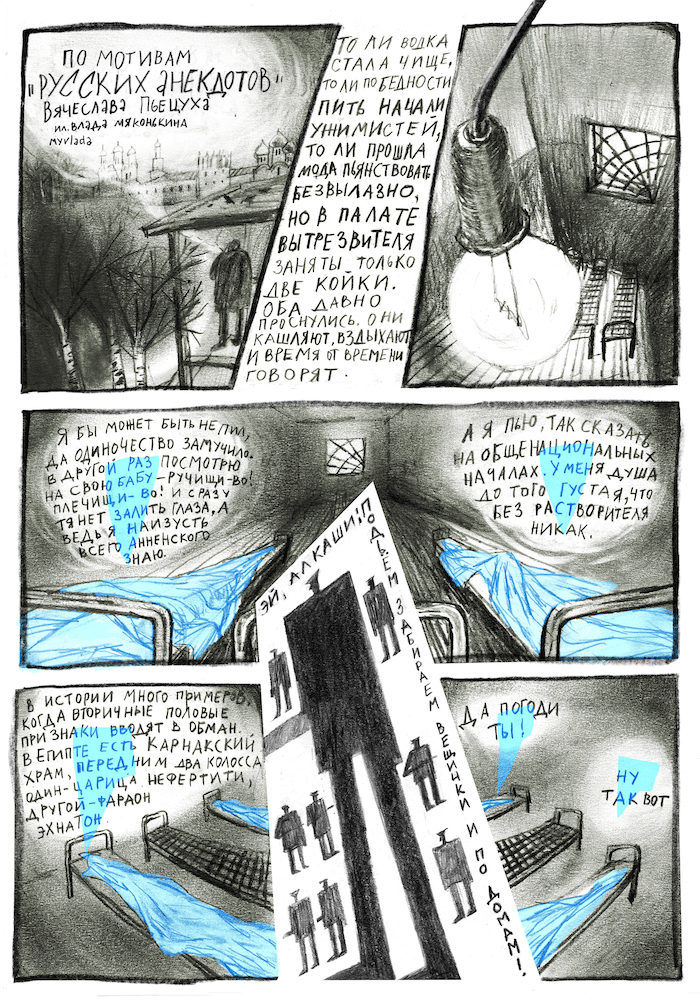 В Петербурге продолжается «Бумфест» — фестиваль рисованных историй, на котором горожане могут познакомиться с лучшими образцами авторского комикса со всего мира. До 12 октября посетители смогут увидеть работы Туве Янссон, оценить современные рисованные истории, посетить мастер-классы по созданию комиксов и принять участие в дискуссиях на актуальные для комикс-культуры темы. До конца фестиваля осталась неделя, однако имена лауреатов конкурса, посвященного в этот раз теме «Соседи», уже известны. Был ли древнеегипетский фараон женщиной, как правильно попросить соседку по парте дать списать, бессловесное путешествие и истории юных художников — «Бумага» публикует пять небольших комиксов победителей «Бумфеста» этого года.Влада Мяконькина, «Русские анекдоты», Москва