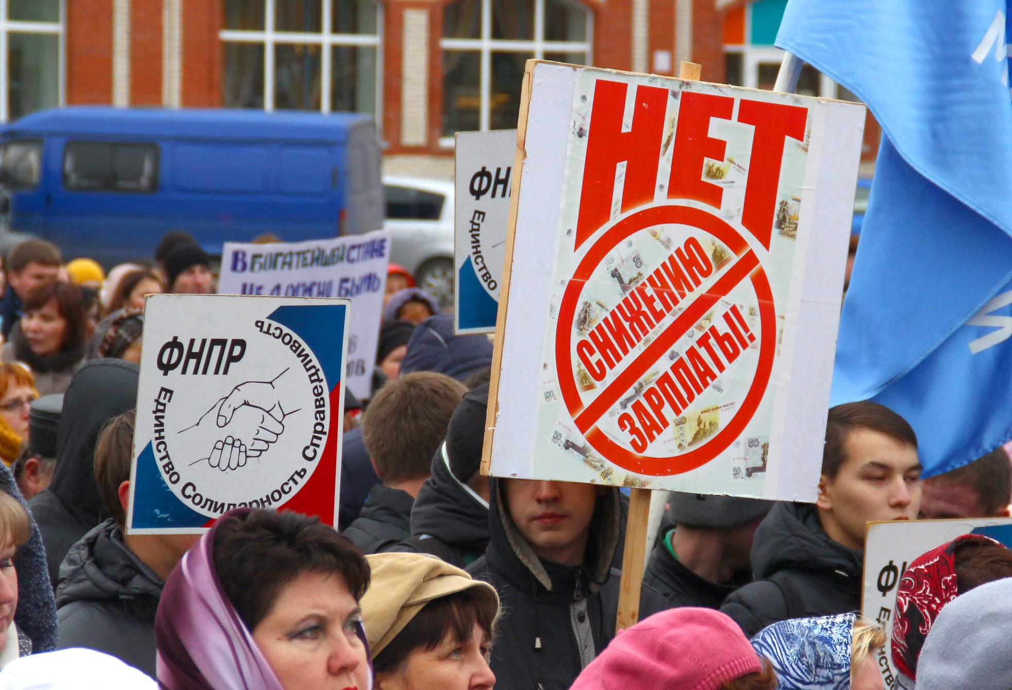 На нескольких лозунгах требования трудящихся чем-то напоминали те самые октябрьские: «Зарплата медиков 10-15 тыс. — позор чиновников!», «Скорой помощи нужна «скорая помощь», «Нищий медик — больная Россия!», более общие: «Человек не должен быть бедным!», «Нет снижению зарплаты!», и едва ли не крамольные: «Жизнь без санкций!».
