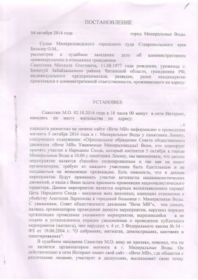 ФСБ посредством ГИБДДПервые задержания в связи с народным сходом произошли еще накануне схода, 4 октября. Михаил Савостин рассказал ОВД-Инфо, что его задержали в Пятигорске те же люди, которые присутствовали при его задержании после Марша Мира и которых он ошибочно принял за сотрудников ФСБ. В этот раз они предъявили ему удостоверения сотрудников Центра по борьбе с экстремизмом. Савостин был доставлен в Минераловодский городской суд и приговорен к двум суткам ареста по ч. 2 ст. 20.2 КоАП как организатор народного схода. В качестве доказательства была приведена публикация на сайте «Вече МВ» (в судебном постановлении утверждается, что ее сделал Савостин с планшета), где утверждалось, что у схода нет организаторов, а его потенциальных участников призывали быть бдительными и пресекать провокации националистического характера. Савостин пояснил ОВД-Инфо, что организатором схода не являлся, а призывал не разжигать межнациональный конфликт. По его словам, после нападения на больницу «все в городе обозлились на армян и хотят радикально со всеми кавказцами разобраться» (среди подозреваемых в причастности к нападению как минимум четверо — представители армянской диаспоры). Находясь в ИВС, больной сахарным диабетом Савостин объявил голодовку в знак протеста.