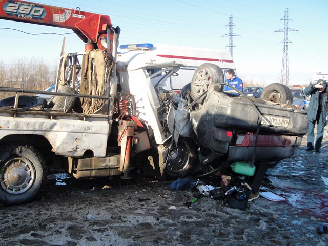 В Нефтеюганске на улице Объездная столкнулись ВАЗ-2112, автомобиль марки Honda и манипулятор Mitsubishi. "Водитель Mitsubishi, водитель и три пассажира ВАЗа от полученных телесных повреждений скончались на месте происшествия. На месте работают полицейские, устанавливают причины и обстоятельства произошедшего, а также личности погибших", - говорится в пресс-релизе главка.