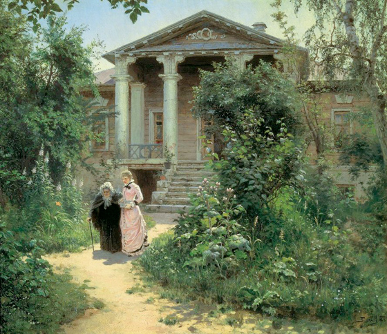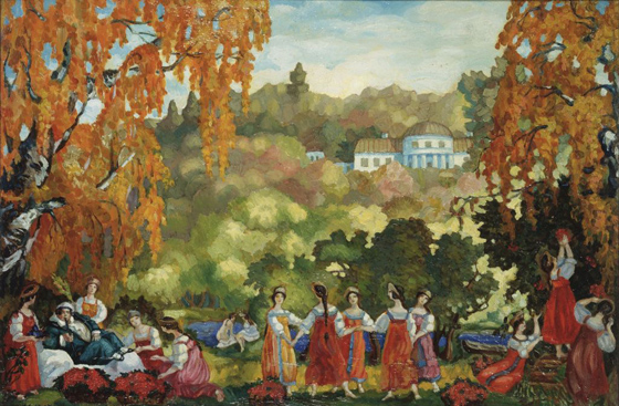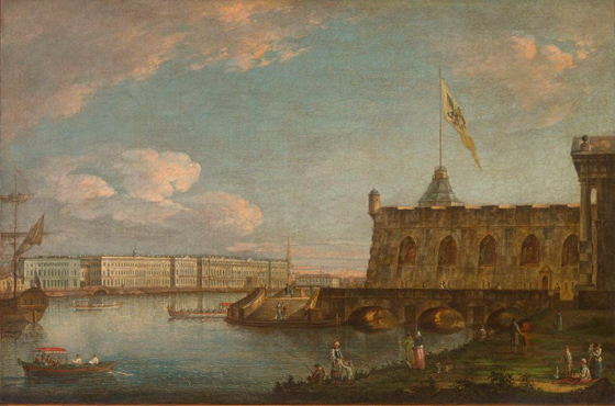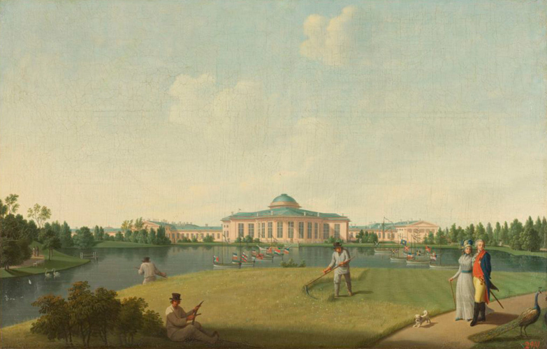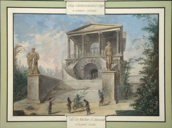 Не всякий зритель подготовлен к рассматриванию архитектурных рисунков, эскизов и проектов, нужно понимать их манеру, следовать мысли архитектора, видеть соотношение разных проекций между собой, читать их соответствие существующим зданиям. Непосвященным этот скупой графический язык может показаться монотонным. Чтобы этого не произошло, выставка обильно включает живопись. Приятно, что это именно живопись и что устроители преодолели искушение использовать популярный язык фотографии, который, несомненно, разрушил бы созданную ими эстетическую среду своим грубым глянцевым натурализмом. Что касается привезенных в Венецию картин, то в основном это хорошо известная классика: портрет архитектора Львова кисти Д.Г. Левицкого, «Екатерина II на прогулке в Царскосельском парке» В.Л. Боровиковского, пейзажи Павловска, написанные Кюгельгеном, картины Григория Сороки с пейзажами и крестьянскими сценами на фоне усадеб. Так мы доходим до Борисова-Мусатова с его усадебной ностальгией и до художников «Мира искусства». В этой части выставочная концепция напоминает игру в художественные «ассоциации» — все, что может вспомнить на эту тему человек, образованный в русском искусстве, тут же всплывает перед глазами живьем, все учтено и представлено. Продолжением этой игры является следующий раздел, посвященный ХХ веку — позднему «Миру искусства», конструктивизму и «сталинскому ампиру».