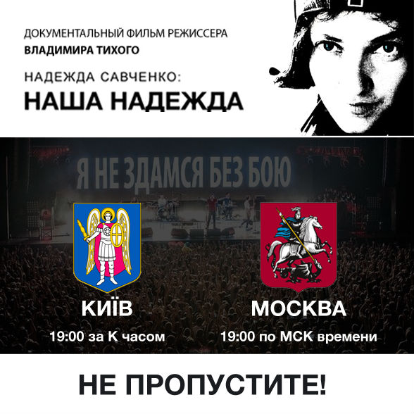 21 октября в 19:00 в московском офисе РПР-ПАРНАС (Пятницкая, д. 14 стр. 1) будет показан документальный фильм Владимира Тихого "Наша Надiя" ("Наша Надежда") об украинской летчице Надежде Савченко, незаконно вывезенной в Россию.