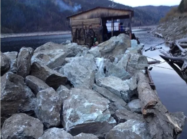 Показалась баржа с буксиром: везут глыбы жадеита — примерно, 50 тонн. На палубе кучкуются заросшие щетиной рабочие. Букин внимательно присматривается к «пассажирам» и достает фотоаппарат. Некоторые закрывают лица, другие равнодушно смотрят на нас. Из-за шума движка я не слышу, что кричит им Букин. Потом подходит ко мне: