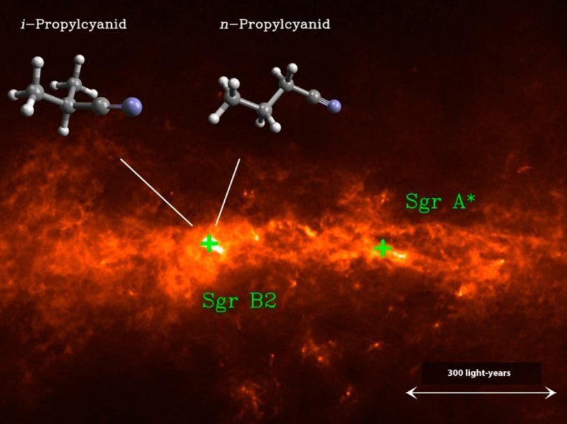 Несколько лет назад астрономы уже обнаружили в том же скоплении Стрелец В2 изомер пропил цианида, отличающийся прямым углеродным «позвоночником» (n-(CH3)2CHCN). Также в этом газовом скоплении найдены гликольальдегид, этиловый спирт, формальдегид, муравьиная и уксусная кислота, этилформиат и этиленгликоль.