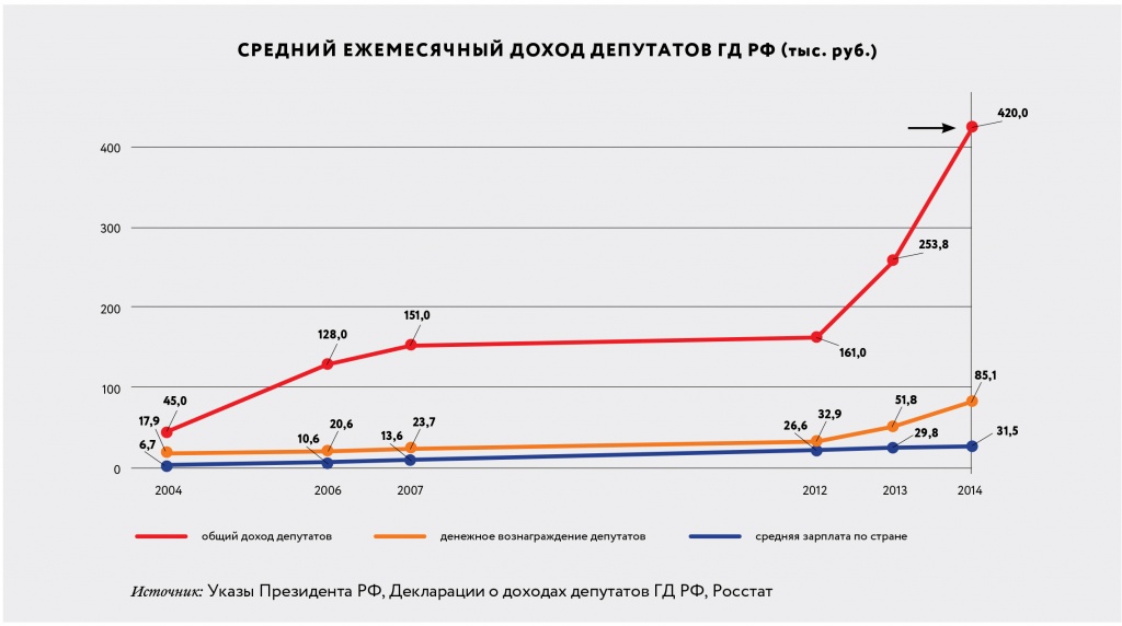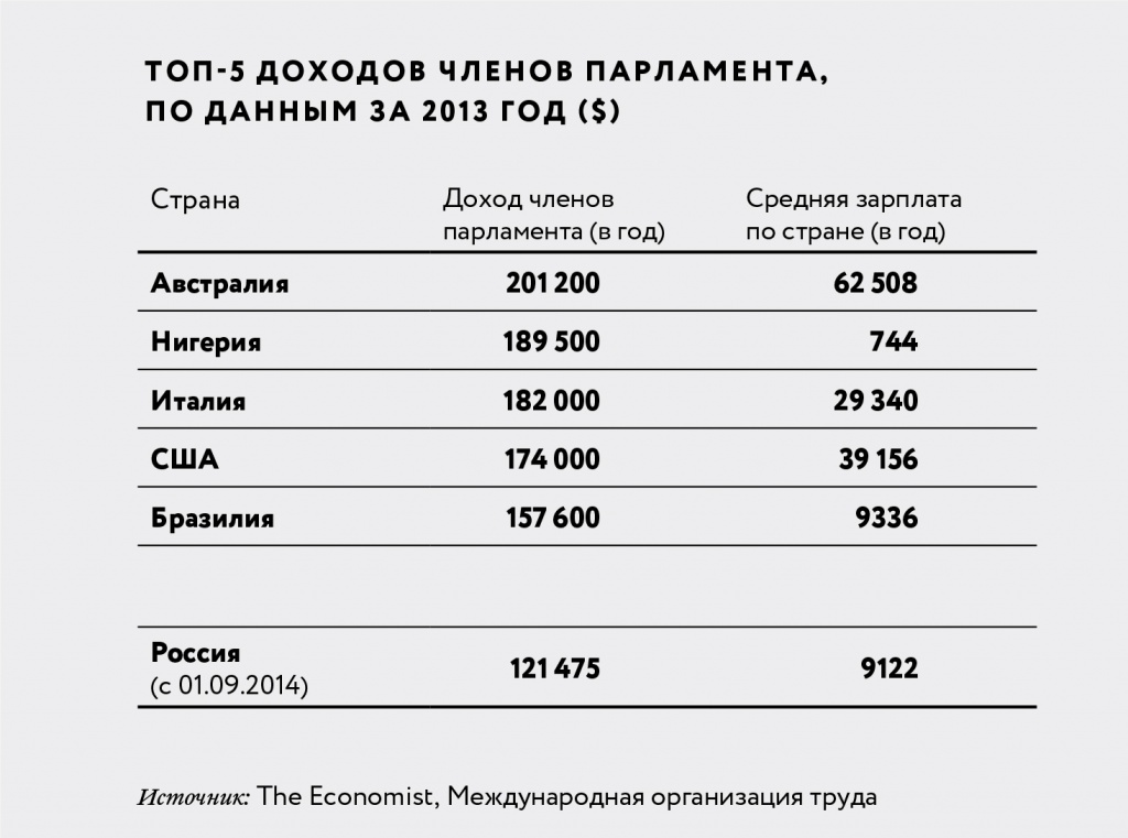 Сейчас разрыв между доходами депутата и средним доходом его избирателя превышает 13 раз, что резко отличается от положения дел в развитых странах. Так, члены немецкого Бундестага имеют ежемесячно около €8000, французские парламентарии — около €7000 (см. справку на стр. 13). Правда, экономисты считают более корректным сравнивать зарплату депутата или чиновника не со средней зарплатой по стране, а с зарплатой специалистов с равной квалификацией, занятых в частном секторе. Но и здесь картина ненормальная, поскольку, в отличие от Запада, у нас на госслужбе получают больше, чем в бизнесе. Профессор кафедры экономики труда и народонаселения, директор Центра трудовых исследований НИУ ВШЭ Владимир Гимпельсон считает, что это очень плохой синдром — Россия все больше превращается в страну третьего мира: «В развитых странах человек, занятый в частном секторе, как правило, получает больше, чем чиновник, потому что в частной компании он несет более высокие риски и рынок эти риски вознаграждает». Зато в Африке или в некоторых странах Латинской Америки и Азии частный сектор — один сплошной риск, зато госслужба обеспечивает стабильный заработок, пенсию, медицинское обслуживание, неплохие социальные гарантии и — если не воровать — почти полное отсутствие рисков. Наконец, бизнес создает прибавочную стоимость и своими налогами наполняет бюджет, депутаты, чиновники, политические назначенцы проходят по расходным статьям бюджета.