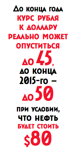 Государству, конечно, выгодно плавно опускать рубль, чтобы, с одной стороны, не случилось резкого обвала и паники, с другой — можно было бы как-то балансировать бюджет. С 1 января 2015 года ЦБ РФ больше не будет проводить валютных интервенций, отказавшись от валютного коридора, но на практике это вряд ли случится. Только с начала октября объем интервенций ЦБ РФ составил более $6 млрд, это помогло сдерживать падение рубля, но так и не смогло обеспечить ему стабильный курс. Все потому, что стабильный курс Минфину и не нужен. При стоимости нефти $80 за баррель доллар должен (и, скорее всего, будет) стоить 50 рублей. Все сейчас надеются, что нефть отскочит обратно и будет стоить в районе $90, тогда курс рубля к доллару может закрепиться на 45. Я думаю, до конца года курс реально может опуститься до 45, до конца 2015-го — до 50 при условии, что нефть будет стоить $80.