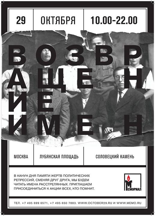 29 октября, в канун Дня памяти жертв политических репрессий, в Москве у Соловецкого камня на Лубянской площади пройдет традиционная акция "Возвращение имен". с 10 до 22 часов, сменяя друг друга, участники акции будут читать имена людей, расстрелянных в Москве в годы Большого террора. Присоединиться к акции можно в любое время.