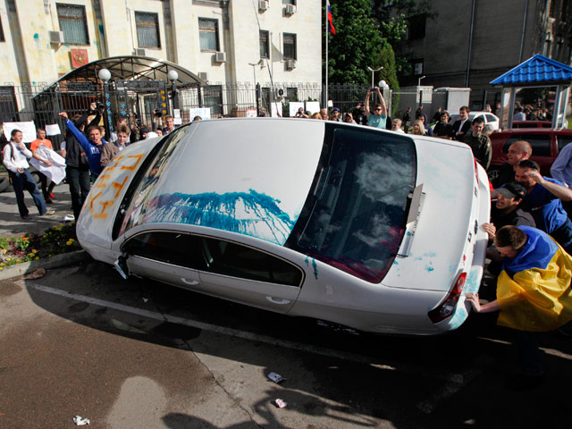 После распевания частушки митингующие у российской дипмиссии перешли в наступление. Они забросали здание посольства взрывпакетами и камнями, сорвали с флагштока российский флаг и водрузили украинский, разрисовали ограждение нацистской свастикой, перевернули припаркованные у посольства автомобили.