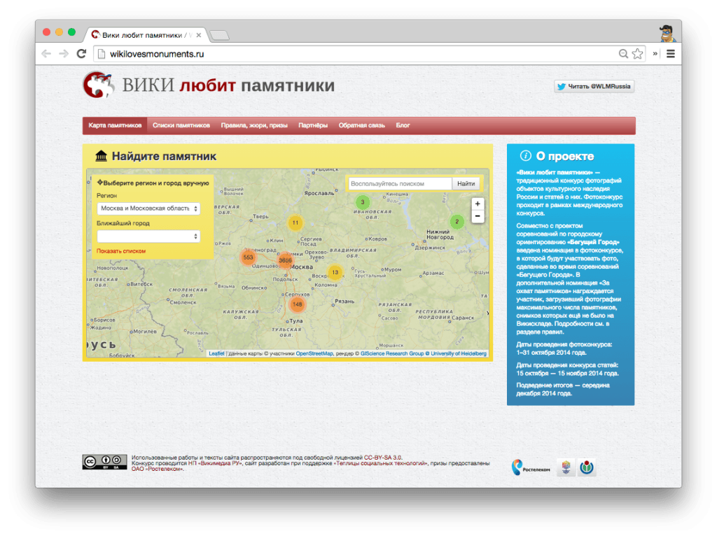 «Вики любит памятники» – это не только конкурс, но и краудсорсинговая платформа, созданная при участии Теплицы социальных технологий на хакатоне в Санкт-Петербурге. Российская версия проекта «Вики любит памятники» работает на основе «OpenStreetMap», краудсорсинговой платформы, позволяющей создавать карту силами добровольцев, а также наносить объекты на карту в выбранных категориях.