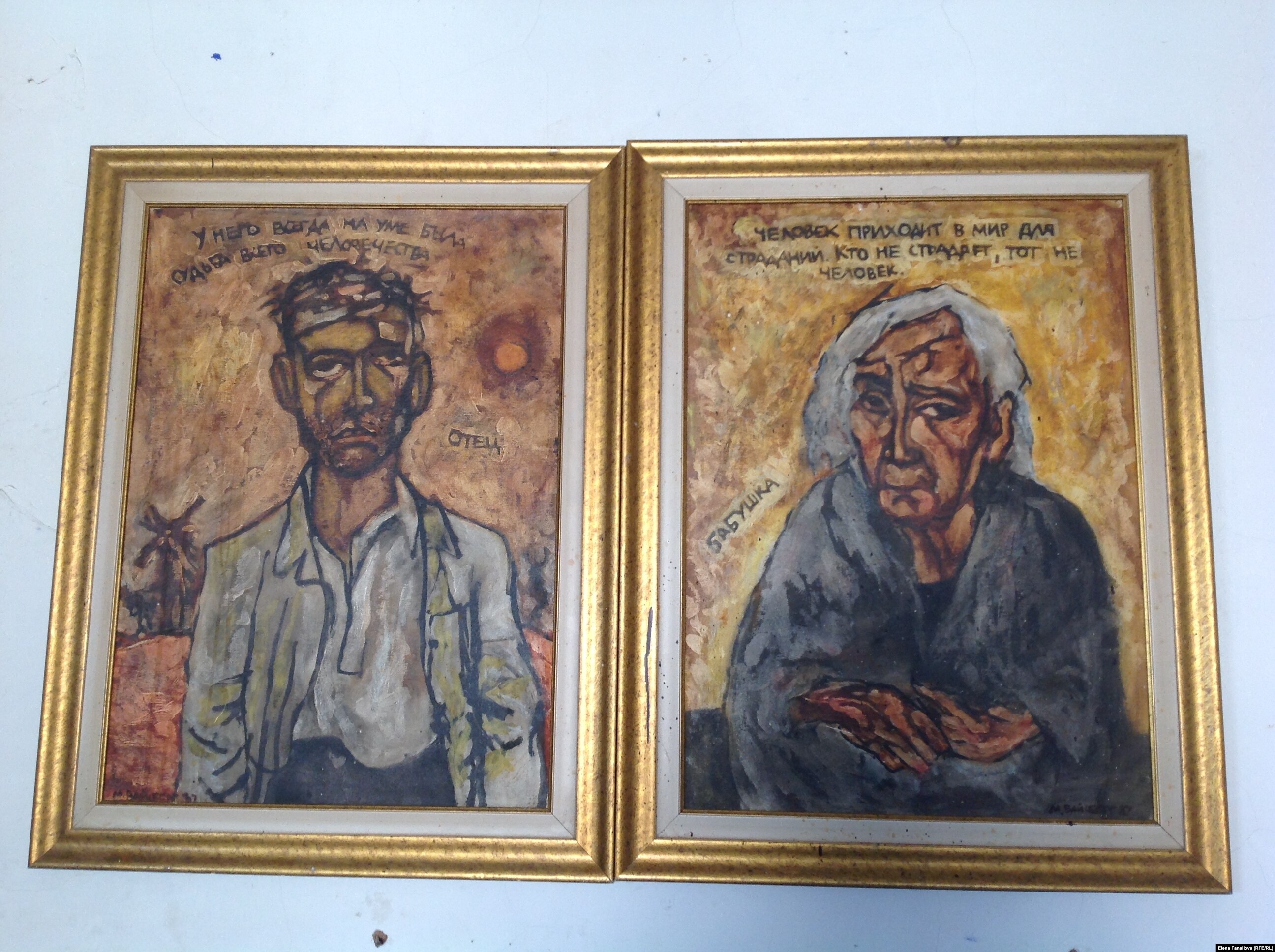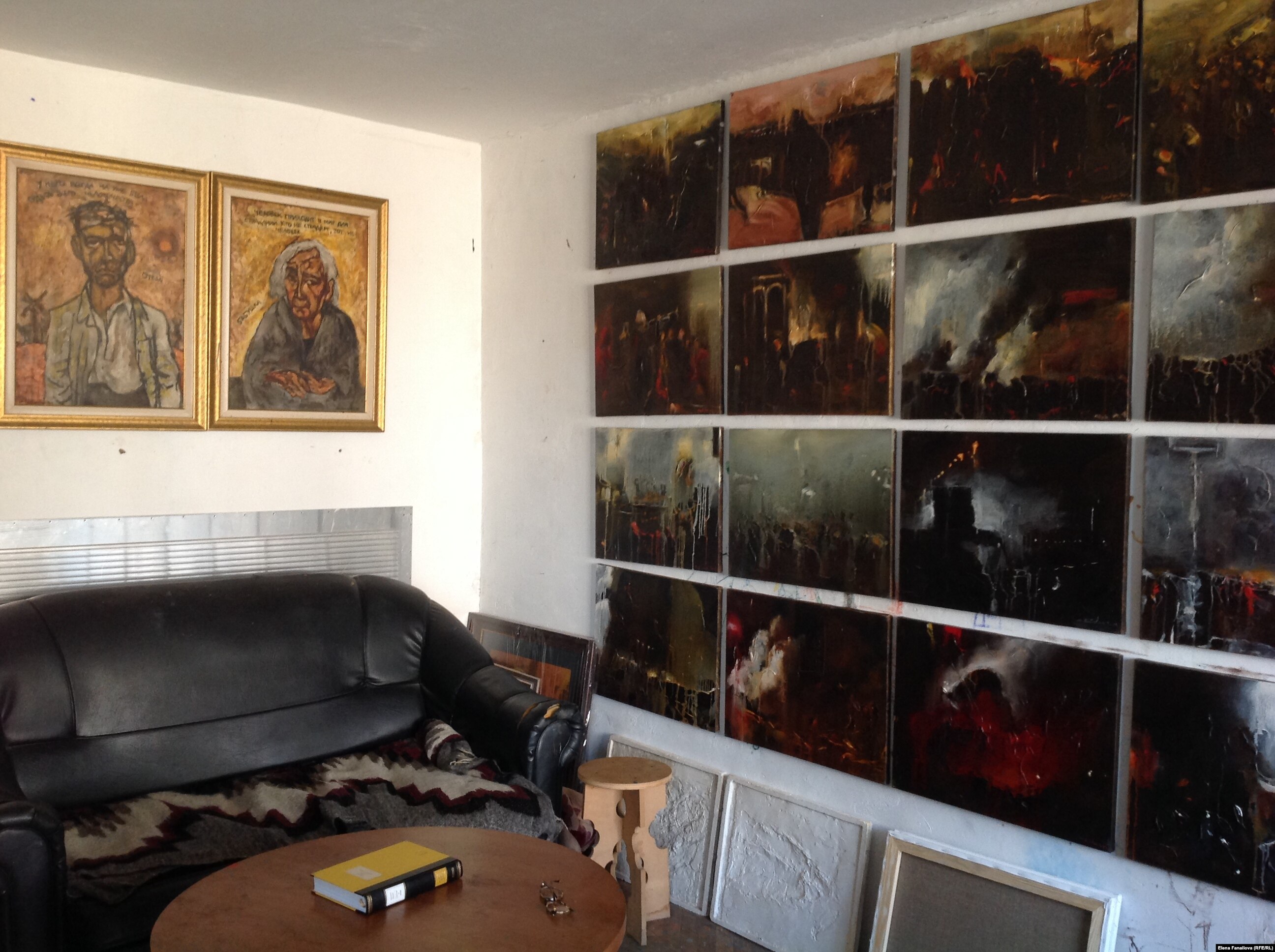 В мастерской две работы из цикла, который был написан Матвеем по мотивам произведений Григория Кановича, а именно это были "Свечи на ветру". И здесь же – цикл Матвея “Стена”, который был написан зимой, за 40 дней, во время событий на Майдане.