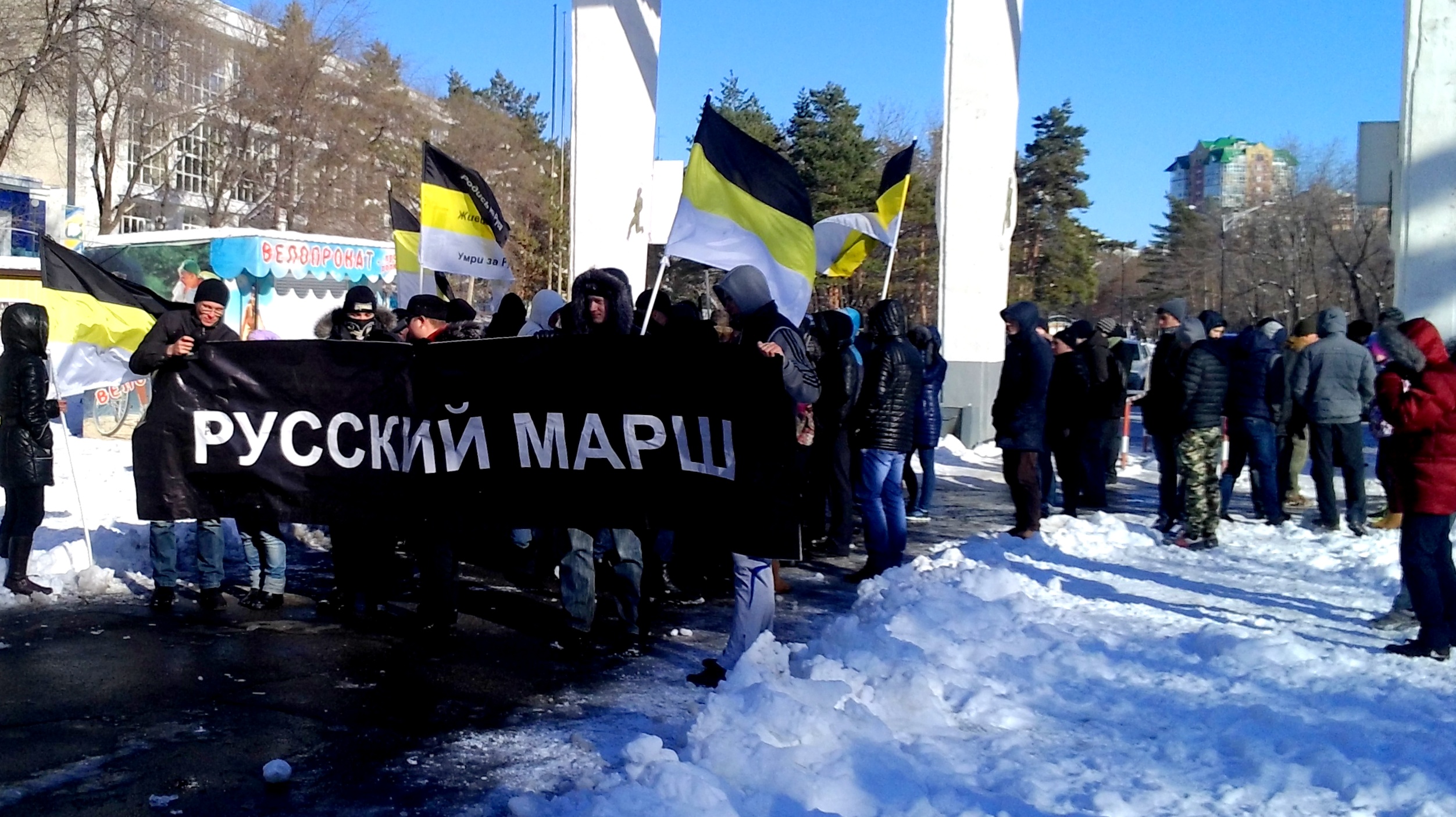 Как рассказал организатор акции Илья Ермолаев, мероприятие носит мирный характер. В этом году, по его словам, власти не препятствовали его проведению. В прошлом году перед "Русским маршем" в Хабаровске были задержаны все его организаторы. Сегодня участники разошлись примерно через час после начала акции.