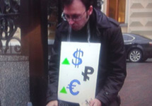 Возле здания Банка России прошла акция под названием "Пожирание рубля", сообщает корреспондент "Граней". Участник арт-движения "Синий Всадник" Олег Басов ел сторублевые банкноты и запивал их американской газировкой на входе в здание. На груди у него был плакат с курсом рубля по отношению к доллару и евро.