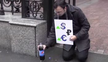Участник арт-движения «Синий всадник» Олег Басов устроил у Центробанка России акцию «Пожирание рубля». Художник встал на колени и стал есть сторублевые купюры, запивая их американской газировкой.