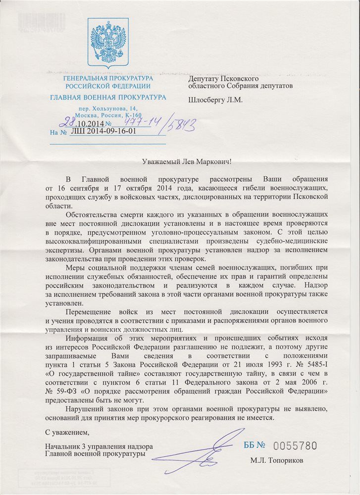 Депутат законодательного собрания Псковской области Лев Шлосберг опубликовал ответ Генпрокуратуры на запрос о псковских десантниках, погибших в июле-сентябре 2014 года.