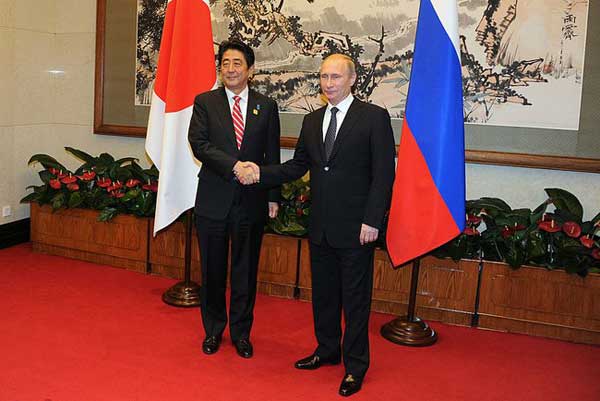 Синдзо Абэ и Владимир Путин в Пекине Комментарий редактора: Ранее в Пекине президент России Владимир Путин встретился с премьером Японии Синдзо Абэ и заявил об успешном развитии отношений между странами, а также пригласил Абэ к обсуждению мирного договора. В конце октября Минэнерго заявило, что производство сжиженного природного газа в России через десять лет увеличится в пять-шесть раз за счет поставок в Японию. Так, российская добыча СПГ будет увеличена с нынешних 10 млн до 50-60 млн тонн в год, а Япония может стать основным рынком сбыта, пояснили в министерстве.
