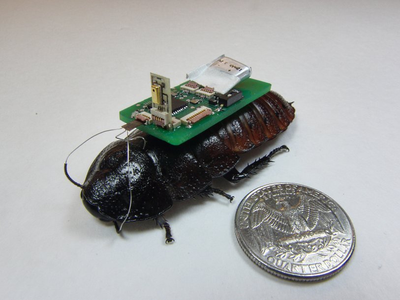 Речь идет о больших мадагаскарских тараканах: длина тела взрослых насекомых до 90 миллиметров, а масса – до 60 грамм. Команда ученых из Университета штата Северная Каролина (США) имплантировала взрослым тараканам и их личинкам крошечные микрофоны, которые позволяют отследить источник звуков. Каждый таракан оснащен маленьким рюкзаком с микрофоном и электроникой, которая подключена к его нервной системе, что позволяет дистанционно управлять насекомым. Электронный «центр управления» тараканом анализирует звук, определяет источник и отправляет насекомое в этом направлении. Эта технология разработана для того, чтобы помогать работникам скорой помощи находить и спасать оставшихся в живых после бедствия.