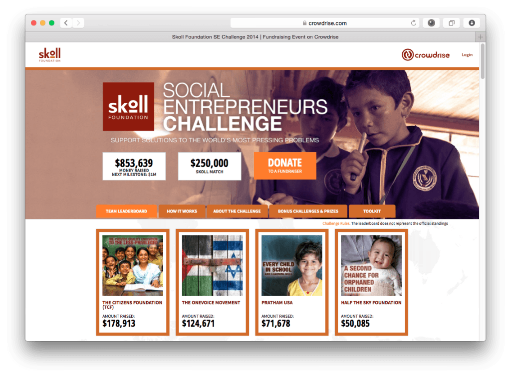 Skoll Foundation внесет до $2 000 000 организациям-участникам. На каждые $500 000, собранных с помощью краудфандинга через платформу Social Entrepreneurs Challenge, фонд Skoll Foundation добавит еще $250 000.