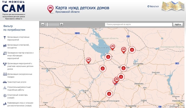 Целью проекта является создание интерактивной карты нужд детских домов области, где в любое время можно узнать, какая именно помощь нужна конкретному детскому учреждению. Подробнее о приложении.