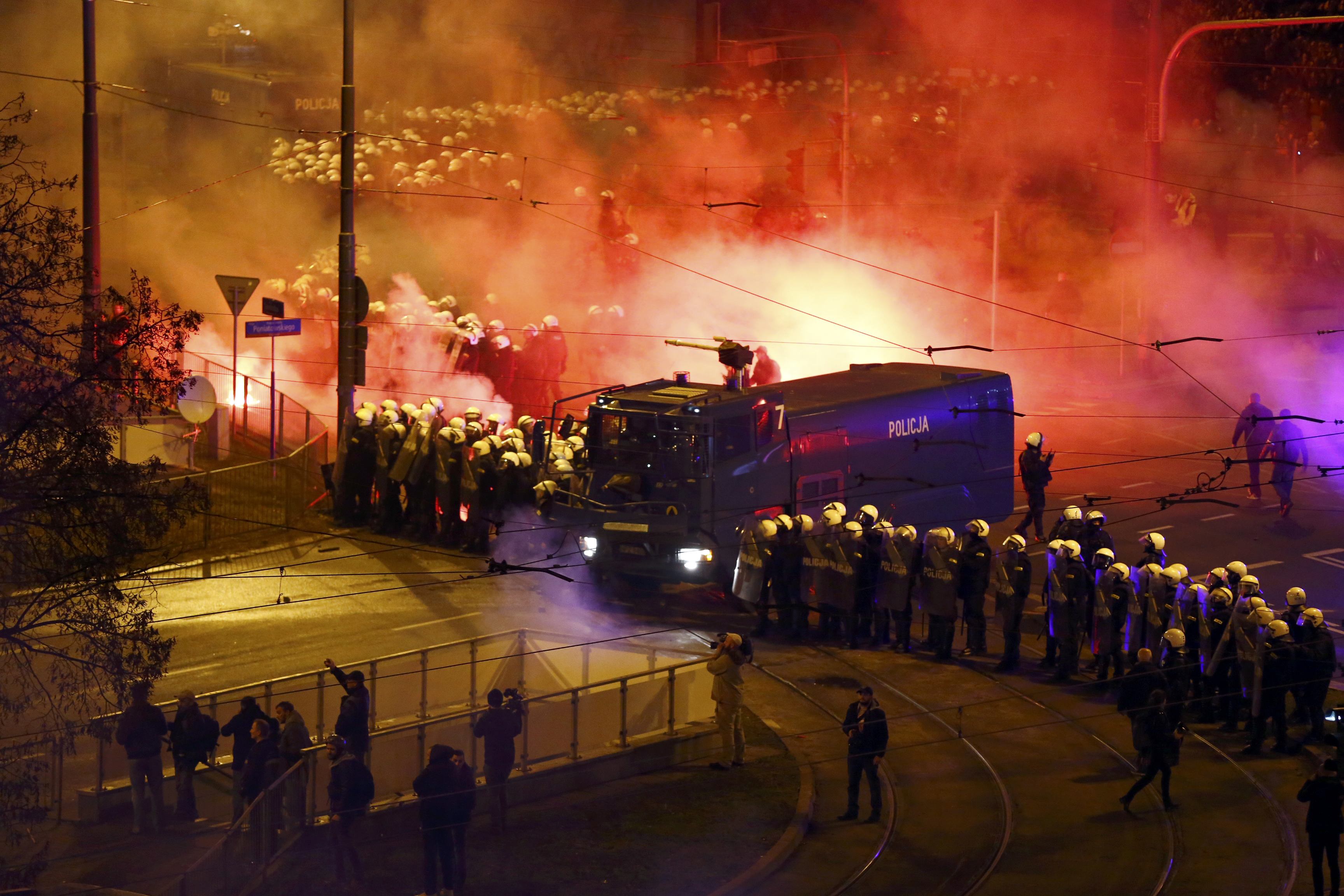Хулиганы, некоторые из которых были в масках, забросали камнями, петардами и булыжниками полицейских, в ответ применивших водометы. Националисты в Польше считают, чтов результате реформ, произошедших за последнее время, под угрозой оказались традиционные народные ценности.