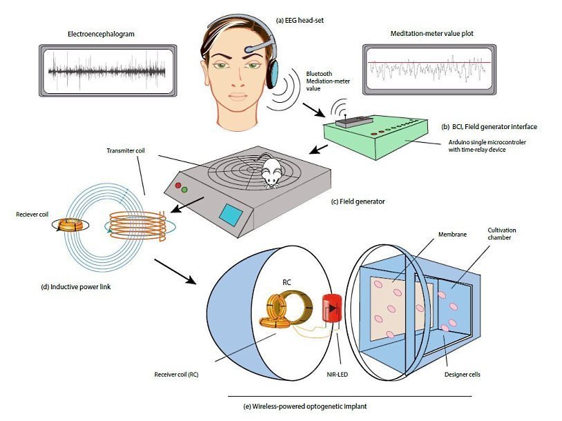 Суть идеи такова: электрическая активность мозга отличается в зависимости от того, в каком состоянии находится человек. Эту активность можно зарегистрировать с помощью электроэнцефалографии (ЭЭГ), а полученный сигнал передается на генератор электромагнитных волн по Bluetooth. Генератор преобразует сигнал ЭЭГ в последовательность таких волн, а они в свою очередь воздействуют на клетки. Технологию тестировали на мышах, под кожу которых вживили имплантаты из человеческих клеток.
