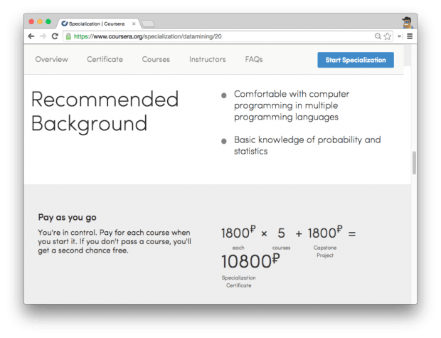 Каждая специальность имеет свой план, в котором можно изучить входящие в нее курсы. При прохождении курсов в платном режиме Signature Track (когда можно получить сертификат не только платформы Coursera при бесплатном прохождении, но и сертификат университета) указывается полная стоимость специальности, а также стоимости отдельных курсов. Если студент оплатил курс, но не завершил его успешно, в следующий раз он может пройти этот курс бесплатно.