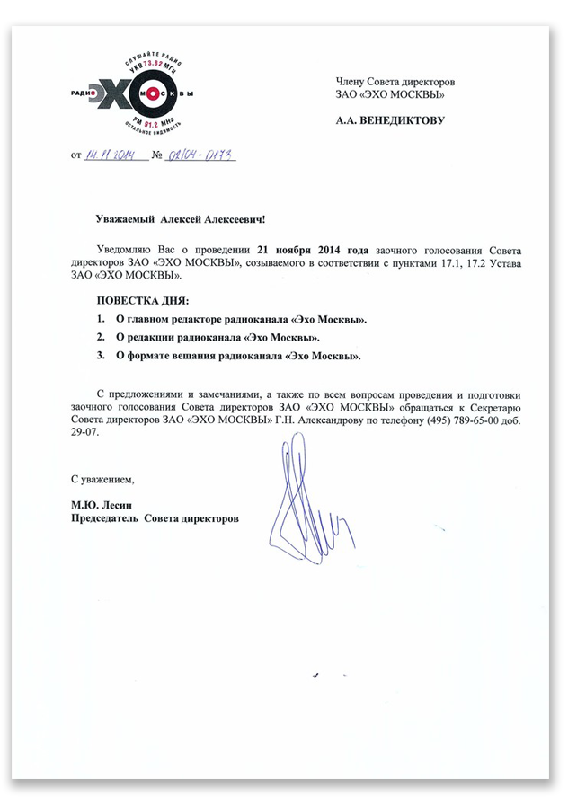 Вопросы поставлены на рассмотрение совета директоров по инициативе Лесина как председателя совета. Они связаны с конфликтом вокруг увольнения ведущего радиостанции Александра Плющева.