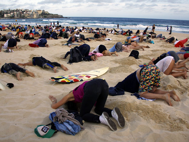 Они самостоятельно вырыли на пляже небольшие ямы и засунули в них головы. При этом некоторые участники акции даже вставали на руки. Таким образом австралийцы намекнули, что действия премьер-министра Австралии Тони Эбботта, который, как они считают, боится ответственности за решение климатических проблем, похожи на поведение страуса.