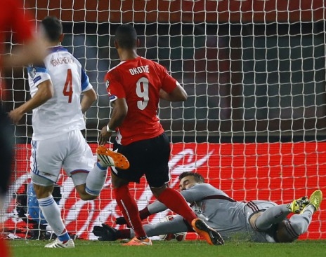 Рубин Окоти забивает гол в ворота сборной России. Фото: Reuters