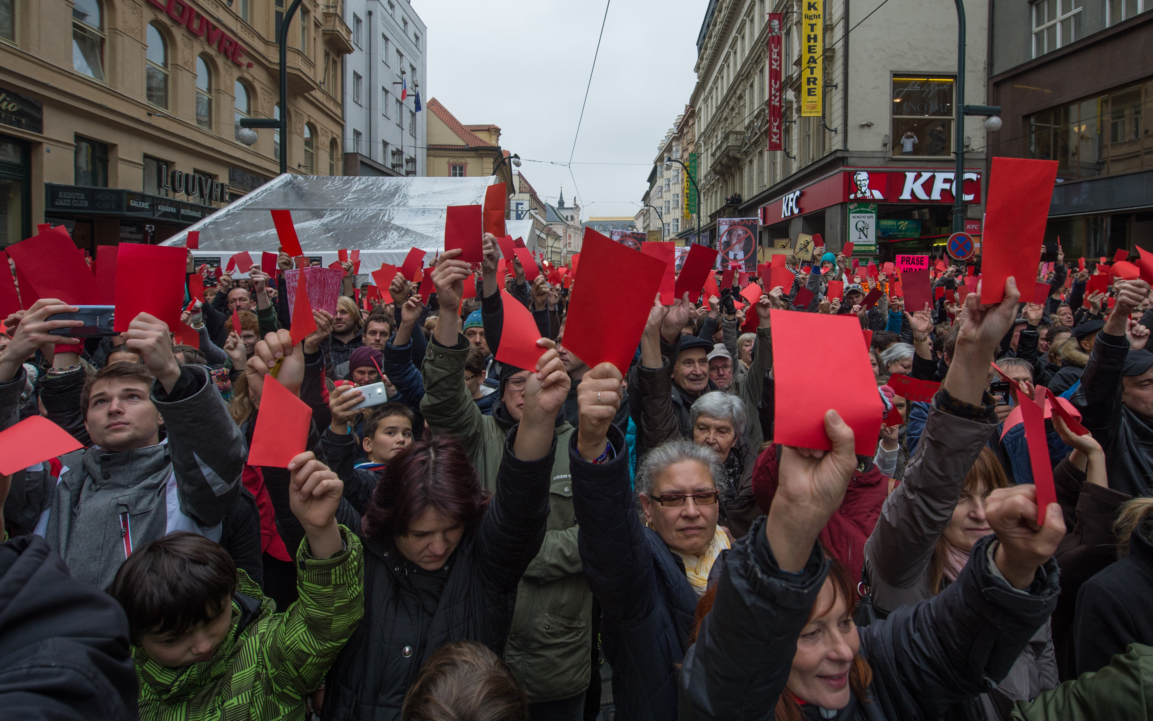 Впрочем, политической ситуацией в Чехии довольны далеко не все. К 25-летию "бархатной революции" была приурочена акция протеста "Красная карточка для Милоша Земана", которую провели в центре Праги граждане, возмущенные политикой и риторикой нынешнего главы Чешской республики. Как передает побывавшая на акции корреспондент Радио Свобода Александра Вагнер, демонстранты принесли с собой символические красные карточки, которые "показали" президенту, требуя его ухода. Характерно, что некоторые протестующие несли транспаранты с лозунгами, одинаковыми или созвучными тем, что можно было увидеть на улицах Праги в дни "бархатной революции": "Гавела на Град" или "Miloše do koše" ("Милоша – в мусорную корзину"; 25 лет назад это относилось к лидеру КПЧ Милошу Якешу, сейчас – к его тезке президенту Земану). По словам нашего корреспондента, в демонстрации приняли участие многие тысячи людей.
